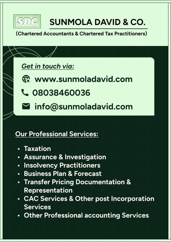 For professional advice on Accountancy, Transfer Pricing, Tax, Assurance, Outsourcing, online accounting support, Company Registration, and CAC matters, please contact Sunmola David & CO (Chartered Accountants & Tax Practitioners) at Lagos, Ogun state Nigeria offices, www.sunmoladavid.com. You can also reach us via WhatsApp at +2348038460036.