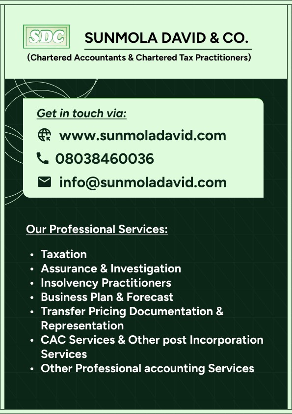 For professional advice on Accountancy, Transfer Pricing, Tax, Assurance, Outsourcing, online accounting support, Company Registration, and CAC matters, please contact Sunmola David & CO (Chartered Accountants & Tax Practitioners) at Lagos, Ogun state Nigeria offices, www.sunmoladavid.com. You can also reach us via WhatsApp at +2348038460036.